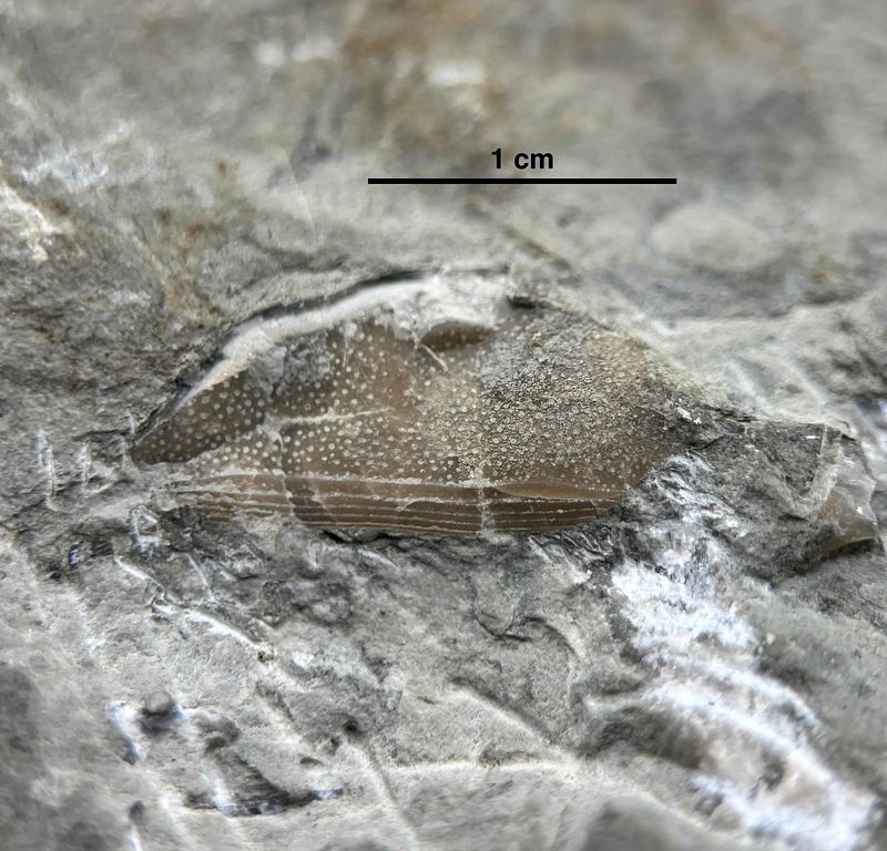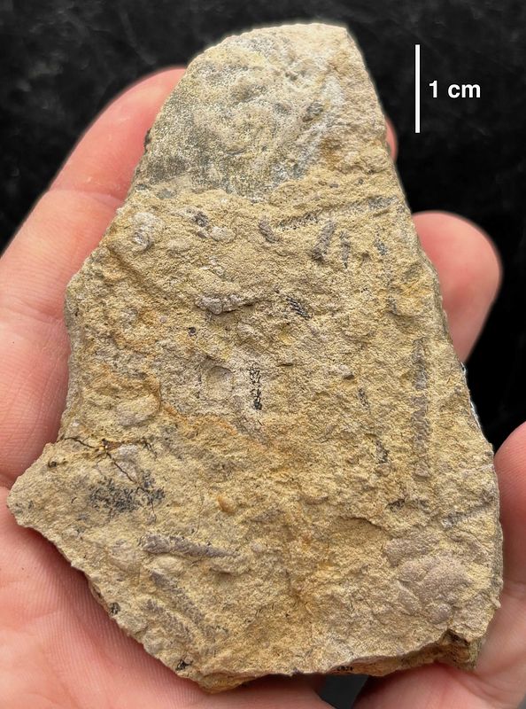 Fossil type: hashplate with graptolites and a trilobite cephalon (bottom right)